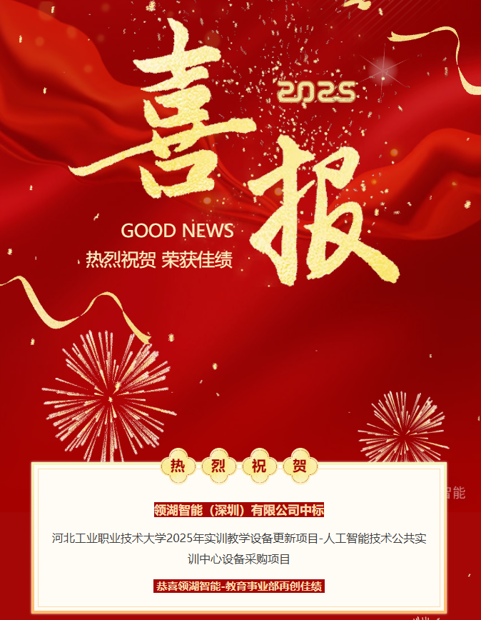 2025年12月4日,在激烈的市场竞争中,领湖智能凭借深厚的技术积淀、完善的职教解决方案与丰富的项目落地经验,经综合评审脱颖而出,成功中标河北工业职业技术大学2025年实训教学设备更新项目——人工智能技术公共实训中心设备采购项目,再度彰显在AI职教装备领域的核心竞争力!此次合作既是对领湖智能技术实力的高度认可,更是与顶尖职教名校携手赋能人才培养的重要实践。
